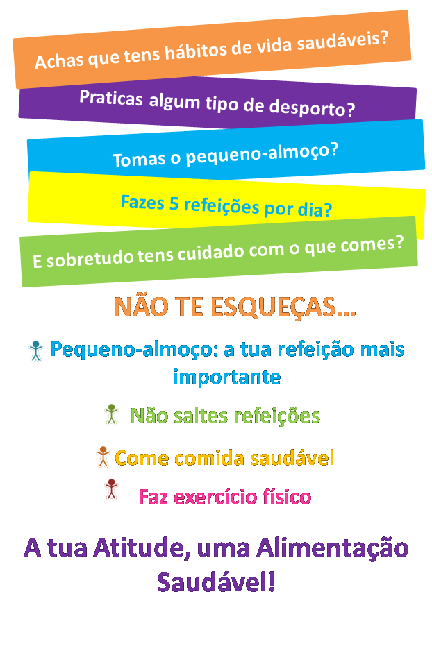 Objectivos: Sensibilizar os jovens para os efeitos nocivos da obesidade; esclarecer sobre os problemas antecedentes da obesidade; promover bons hábitos alimentares; estimular a prática de exercício físico